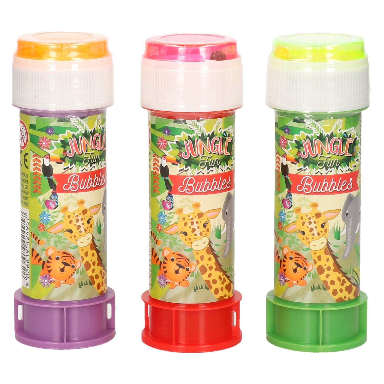 10x Jungle/safari dieren bellenblaas flesjes met spelletje 60 ml voor kinderen. Een bellenblaasflesje met opdruk van wilde dieren, met een bal spelletje in de dop. U ontvangt een willekeurige kleur/opdruk, dit kunnen dezelfde zijn maar ook verschillende. Materiaal flesje: kunststof. Inhoud: ca. 60 ml. Uitdeel/grabbelton speelgoed voor o.a. kinderfeestjes.