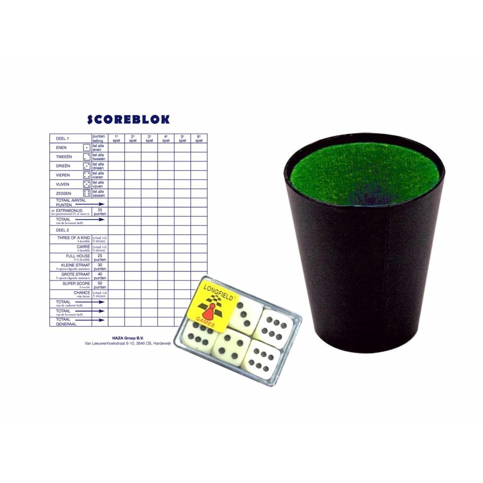 Familiespellen – dobbelspelletjes. Let op: dit is geen speelgoed en niet geschikt voor kinderen. , Dit artikel bestaat uit:, 1x Longfield games Dobbelstenen – 6x stuks – 1,6 cm – dobbel spellen, 1x Sigel scoreblok Yahtzee 250 vellen – Dobbelspellen – Familiespelletjes, 1x Dobbelbeker – zwart/groen – 9 cm – Yahtzee spel – dobbelstenen beker