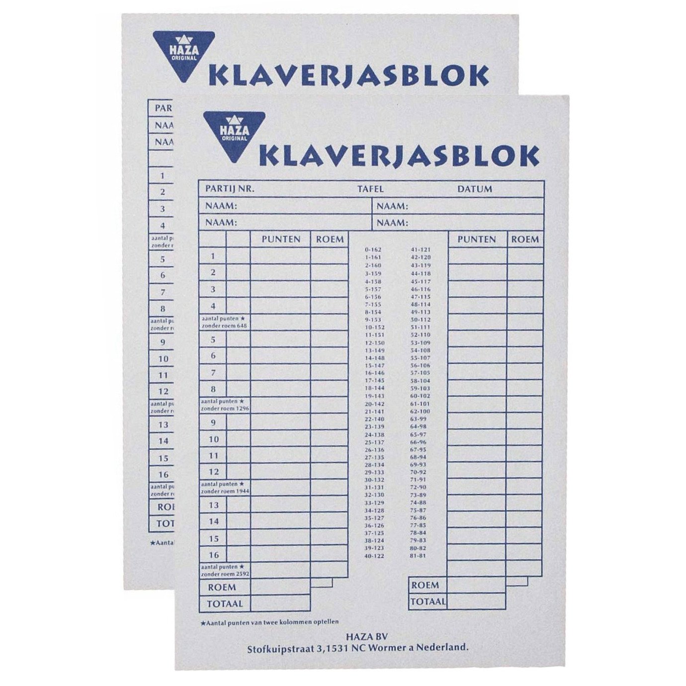 2x Scoreblok Klaverjassen 50 vellen. Scoreblok/klaverjasblok om uw punten bij te houden met het kaart spelletje Klaverjassen. Dit blok bevat 50 velletjes en heeft een formaat van ca. 14,8 x 21 cm. Materiaal: papier. U ontvangt in totaal 2 stuks.