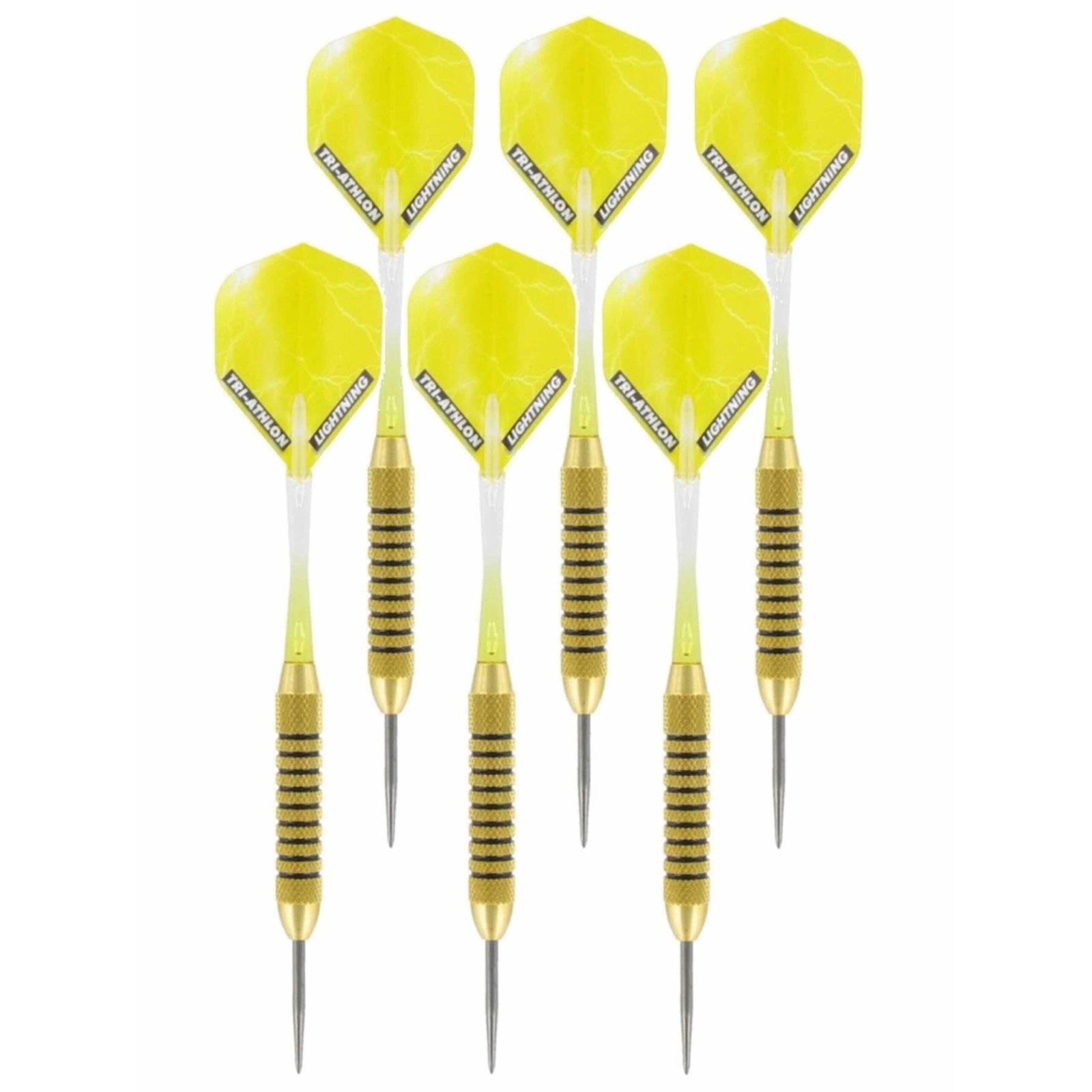 2x Set van 3 dartpijlen Speedy Yellow Brass 21 grams. 2x set van 3 dartpijlen met een messing (Brass) barrel, een PVC shaft, stalen punt en wordt standaard geleverd met Metallic Lightning flites. Door de ringgrip barrel heeft deze pijl een goede grip. Een set bevat 3 complete darts. U ontvangt 2x sets.