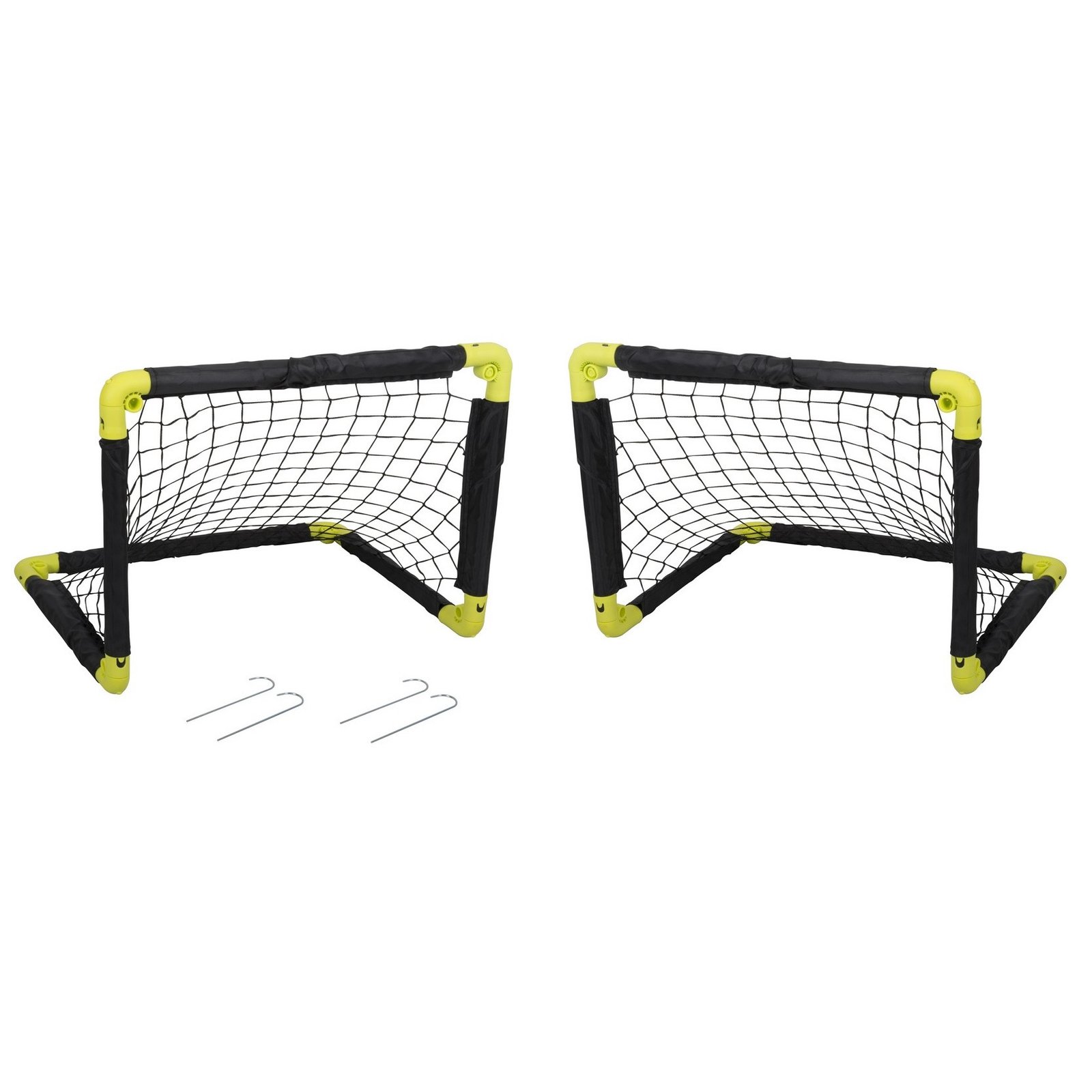 2x opvouwbaar voetbaldoel, in de kleur zwart/geel. Na het voetballen kan het doel, door de scharnieren in de hoekpunten, plat worden opgevouwen waardoor het bijvoorbeeld naast een kast of onder het bed kan worden geschoven. Afmeting: ca. 50 x 44 x 44 cm. Materiaal: plastic/metaal met nylon net. Gewicht: ca. 0,6 kg. Incl. 4 haringen. Buitenspeelgoed voetballen goals/doelen voor kinderen.