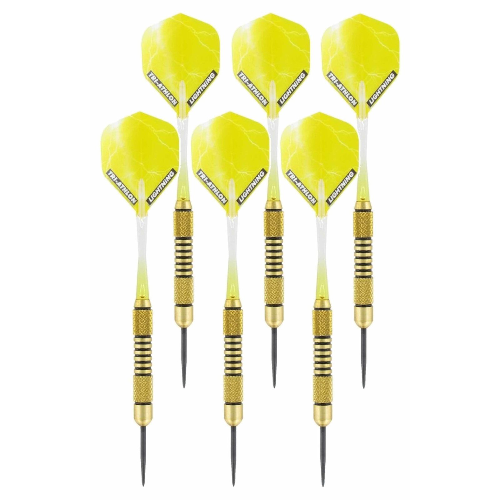 3x Set van 3 dartpijlen Speedy Yellow Brass 19 grams. 3x set van 3 dartpijlen met een messing (Brass) barrel, een PVC shaft, stalen punt en wordt standaard geleverd met Metallic Lightning flites. Door de ringgrip barrel heeft deze pijl een goede grip. Een set bevat 3 complete darts. U ontvangt 3x sets.