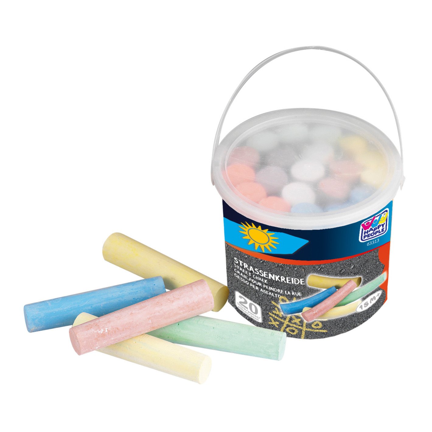 40x Stoepkrijt gekleurd in emmer. Deze plastic emmer heeft een handvat en bevat 20 stoepkrijtjes in verschillende kleuren met per stuk een formaat van ca. 10 x 2 cm.
