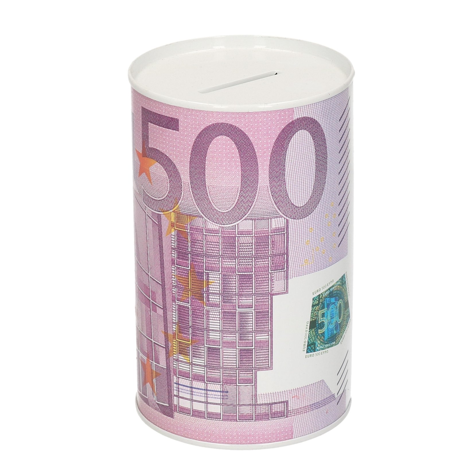 500 euro biljet spaarpot 13 cm. Deze metalen blikspaarpot heeft een opdruk van een 500 euro biljet. De spaarpot dient u met een blikopener te openen. Afmeting: ca. 8 x 13 cm.