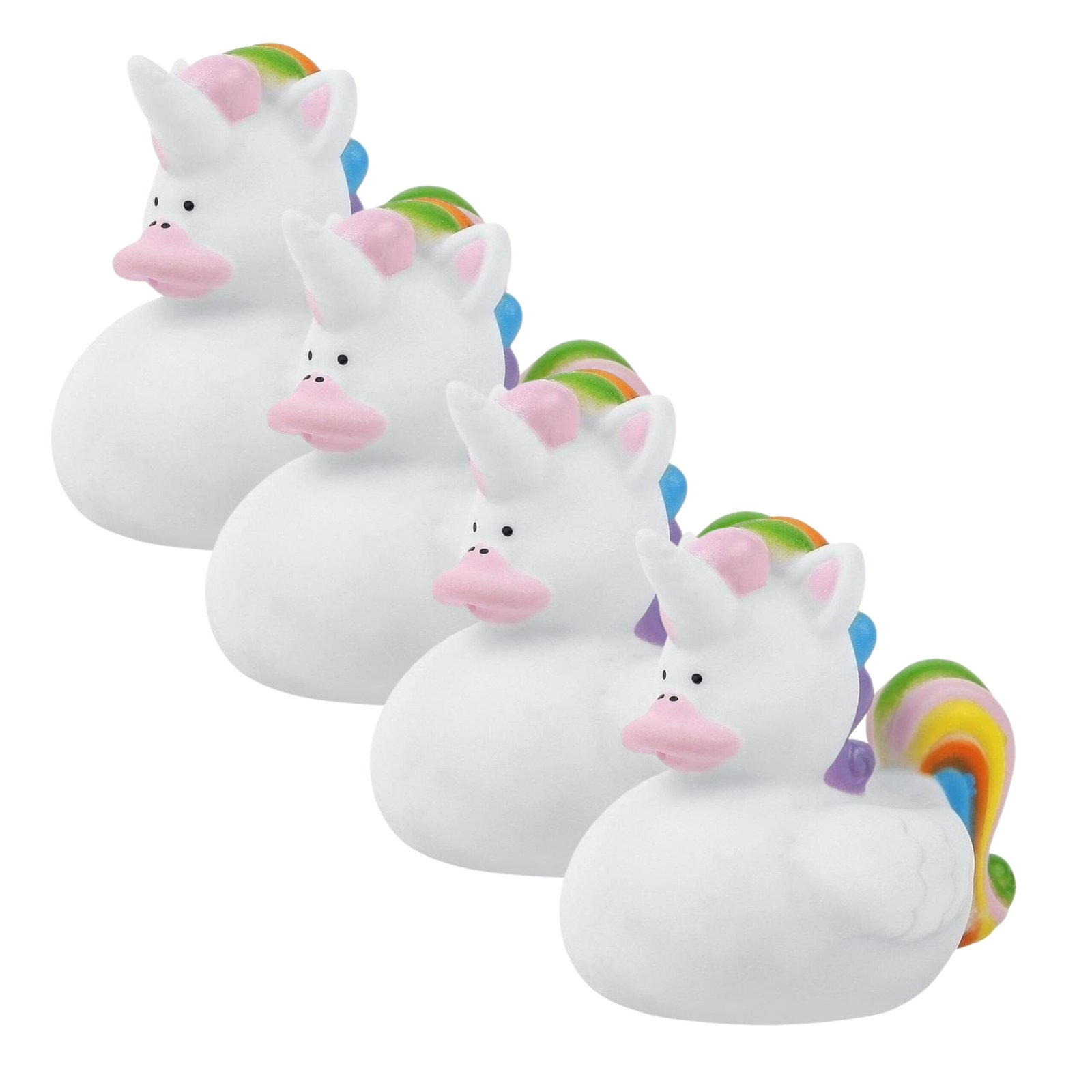 8x Rubberen eenhoorn badeendjes. Afmeting: ca. 7 x 4,5 x 6 cm. De eenhoorn heeft een gaatje onderin waardoor deze kan piepen en is niet BPA-vrij. Niet geschikt voor kinderen onder de 3 jaar.