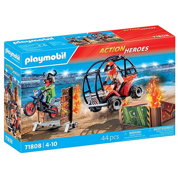 Volop actie in de stuntshow! De grote springschans belooft veel turbulente stunts. Welke rijder durft door de houten wand en de vlammen te springen? Incl. stuntmotor, quad met afneembare rolbeugel en terugtrekmotor, twee rijders en talloze accessoires. Maak je klaar voor bloedstollende sensaties bij de PLAYMOBIL Stunt Show! De motorrijder springt van de helling om door de slingerende plankmuur te crashen of door vlammende vlammen te vliegen. Ondertussen maakt de quadrijder zich klaar voor een vurige stunt en scheurt hij in stijl over de hoge helling. De set bevat een pull-back motor quad voor snelle actie, een stuntmotor voor epische sprongen en tal van accessoires. De verwijderbare helling en muur maken het gemakkelijk om de stunts te wisselen, terwijl de slingerende plankmuur een realistisch tintje toevoegt terwijl hij beweegt bij impact. Perfect voor kleine sensatiezoekers, de PLAYMOBIL Stunt Show levert elke keer weer actievol plezier.