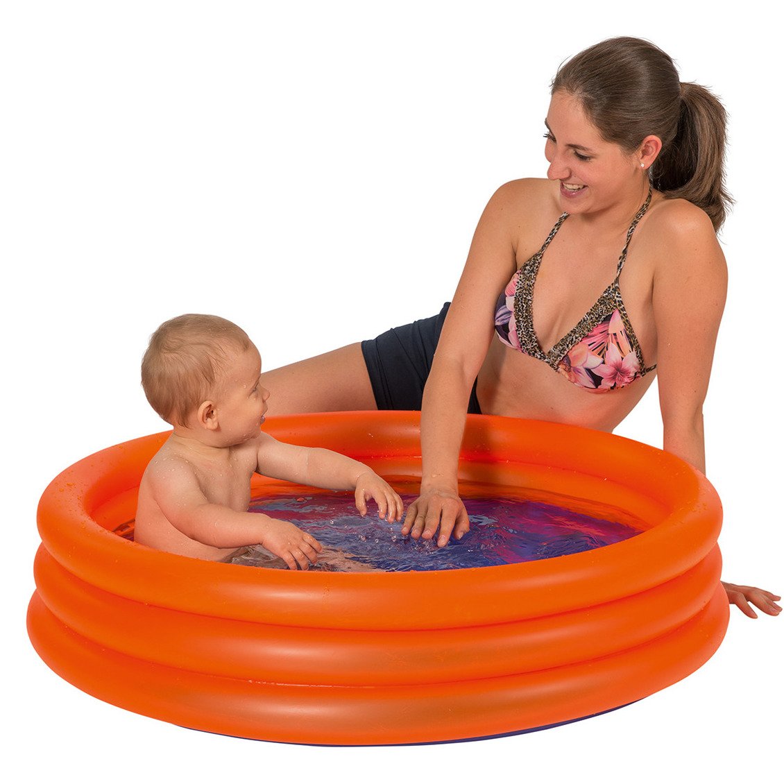 Oranje opblaasbaar zwembad voor de allerkleinsten, met afmetingen 100 x 23 cm, baby en peuters speelgoed. Rond zwembadje in compact formaat met drie banden/ringen.