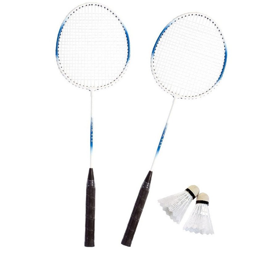 Badminton set blauw/wit met draagtas. Deze 3 sterren kwaliteit badminton set wordt geleverd met 2 rackets, 2 shuttles en een opbergtas. Voorzien van acryl snaren en een sterk frame van gehard staal. Lengte rackets: ca. 66 cm. Badminton rackets en shuttles set voor op reis/camping/vakantie.