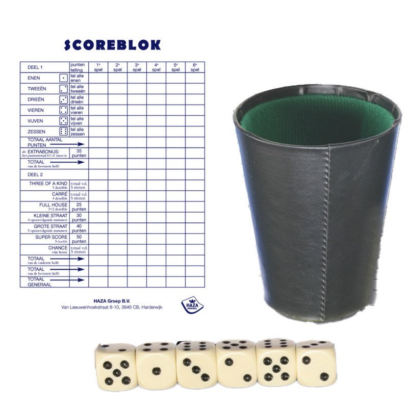 Complete speelset met beker, 6x dobbelstenen en 2x scoreblok. Materiaal dobbelbeker: kunstleder. De dobbelstenen hebben per stuk een formaat van circa 1,6 centimeter. , Dit artikel bestaat uit:, 1x Sigel scoreblok Yahtzee 250 vellen – Dobbelspellen – Familiespelletjes, 1x Dobbelspel met beker – inclusief 6x dobbelstenen en scoreblok – speelset