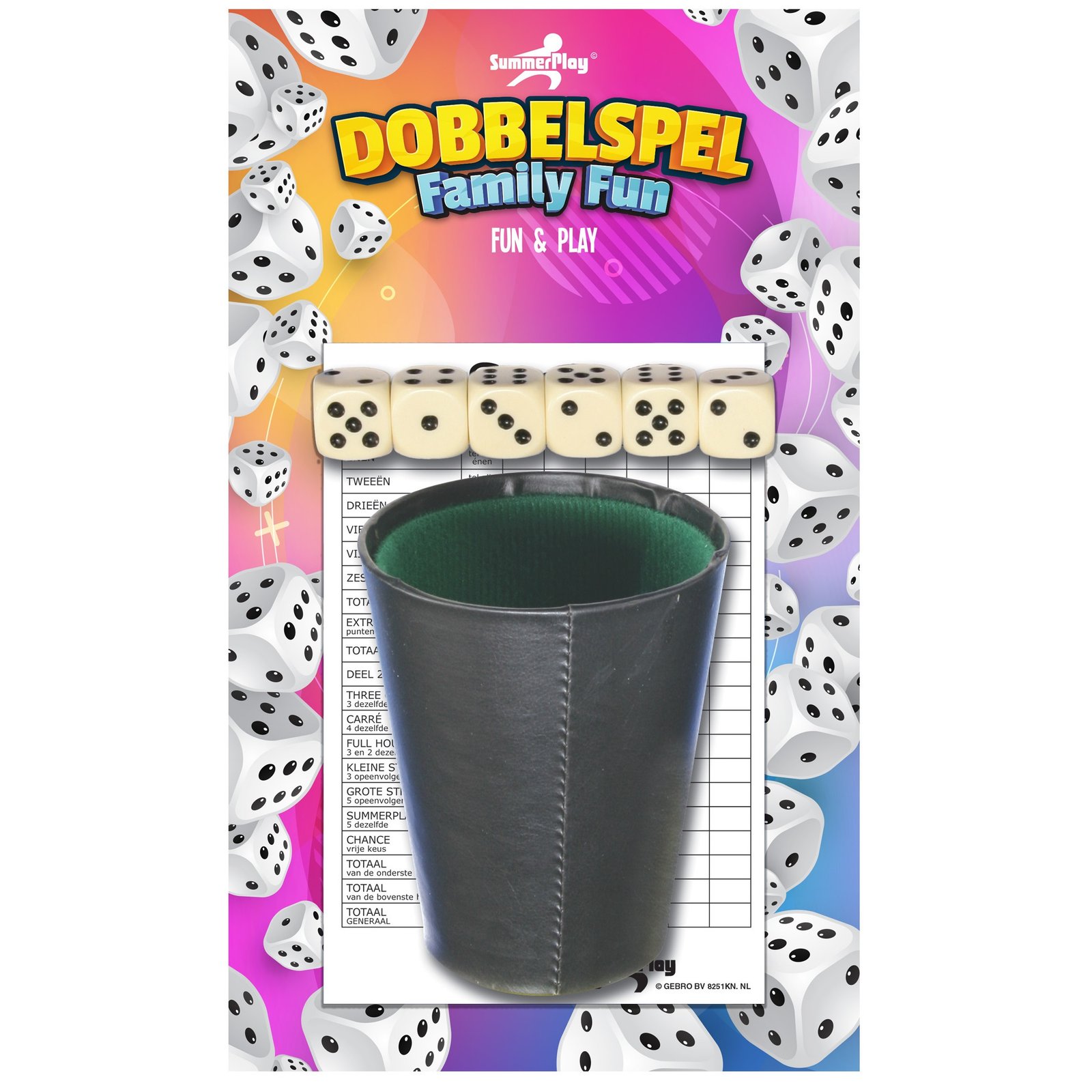 Complete speelset met beker, 6x dobbelstenen en scoreblok van het merk SummerPlay. Materiaal dobbelbeker: kunstleder. De dobbelstenen hebben per stuk een formaat van circa 1,6 centimeter.