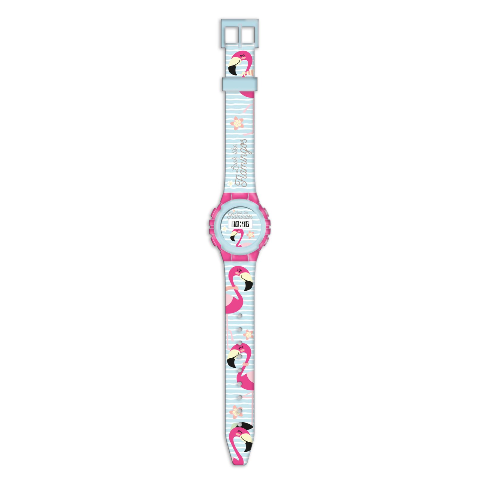 Flamingo digitaal horloge voor meisjes. Digitaal kinderhorloge met flamingos en de tekst Look like Flamingos op het bandje en een flamingo op het uurwerk. Het horloge sluit met een druksluiting. Materiaal glas: plexiglas. Lengte horlogeband: 23 cm. Materiaal horlogeband: rubber. Materiaal horlogekast: kunststof. Afmetingen verpakking: 27 x 4.5 cm. Diameter klokje: 20 mm. Kinderhorloges/kinderuurwerken.