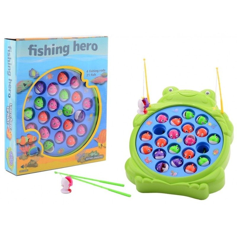 Hengelspel/visvang spel voor kinderen. Dit 25-delige visspel werkt op 2 AA-batterijen welke niet zijn inbegrepen. Het spel bestaat uit 1 plateau in de vorm van een kikker, 21 kleurrijke vissen en 4 hengels. Het plateau draait rondjes en de vissen openen af en toe hun mond zodat ze met de hengel uit het plateau gevist kunnen worden. Formaat plateau: 25 x 30,5 x 21,5 cm. Fishing Hero hengelspel – Behendigheidsspellen speelgoed.