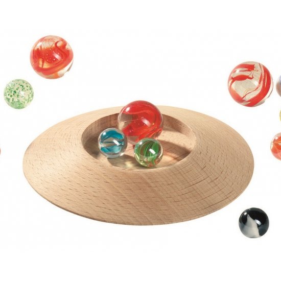 Houten knikkerpot met knikkers. Deze houten knikkerpot heeft een formaat in diameter van ongeveer 12 cm en wordt geleverd met 31 knikkers in zakje.