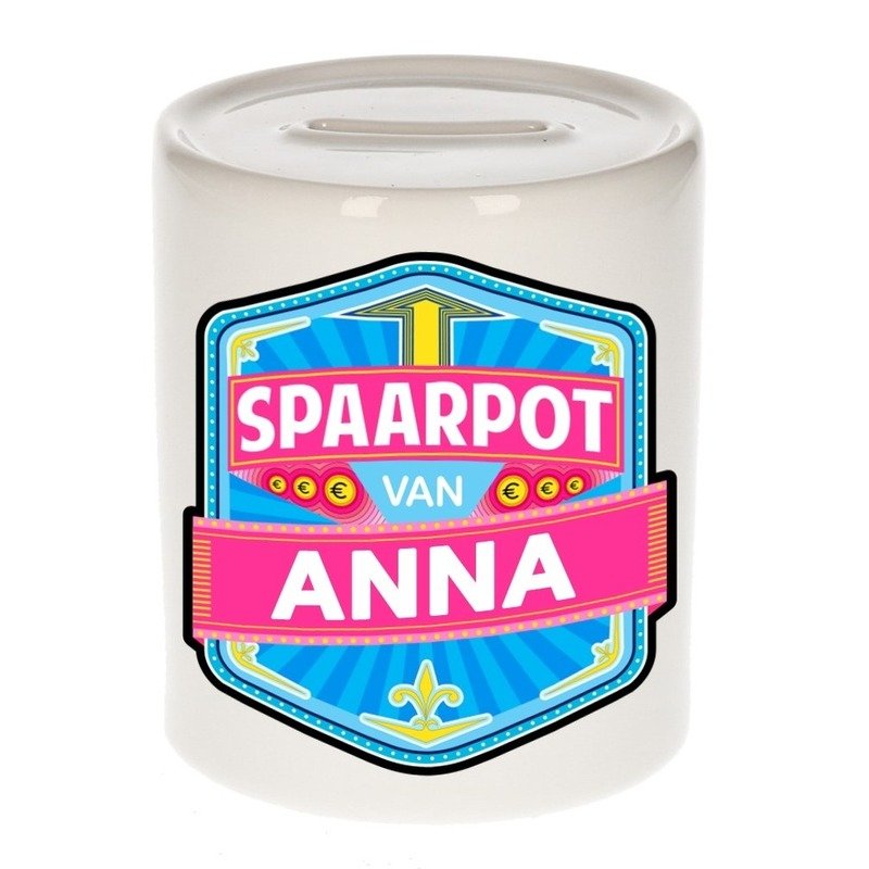 Kinder naam spaarpot voor Anna. Leuke kinder spaarpot met een vrolijk gekleurde opdruk. Deze kinder spaarpot voor Anna is gemaakt van keramiek en heeft een diameter van 8 cm en een hoogte van 9 cm. In kleur wit. Sparen moet je leren.