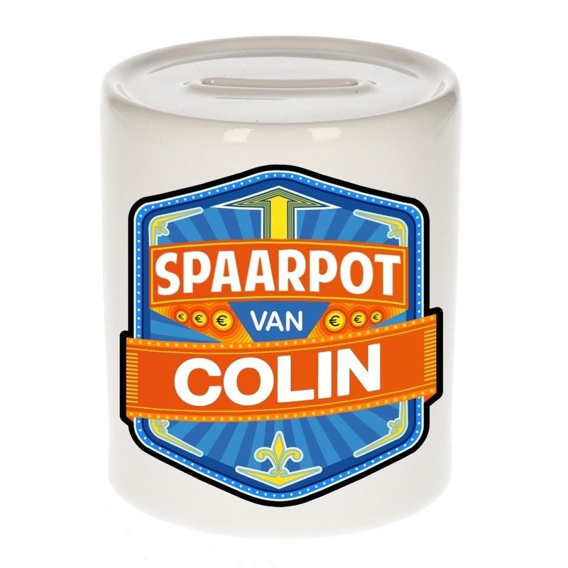Kinder naam spaarpot voor Colin. Leuke kinder spaarpot met een vrolijk gekleurde opdruk. Deze kinder spaarpot voor Colin is gemaakt van keramiek en heeft een diameter van 8 cm en een hoogte van 9 cm. In kleur wit. Sparen moet je leren.
