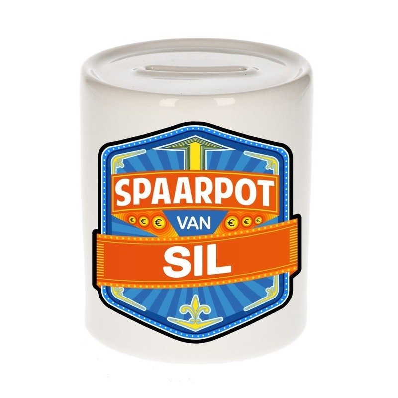 Kinder naam spaarpot voor Sil. Leuke kinder spaarpot met een vrolijk gekleurde opdruk. Deze kinder spaarpot voor Sil is gemaakt van keramiek en heeft een diameter van 8 cm en een hoogte van 9 cm. In kleur wit. Sparen moet je leren.