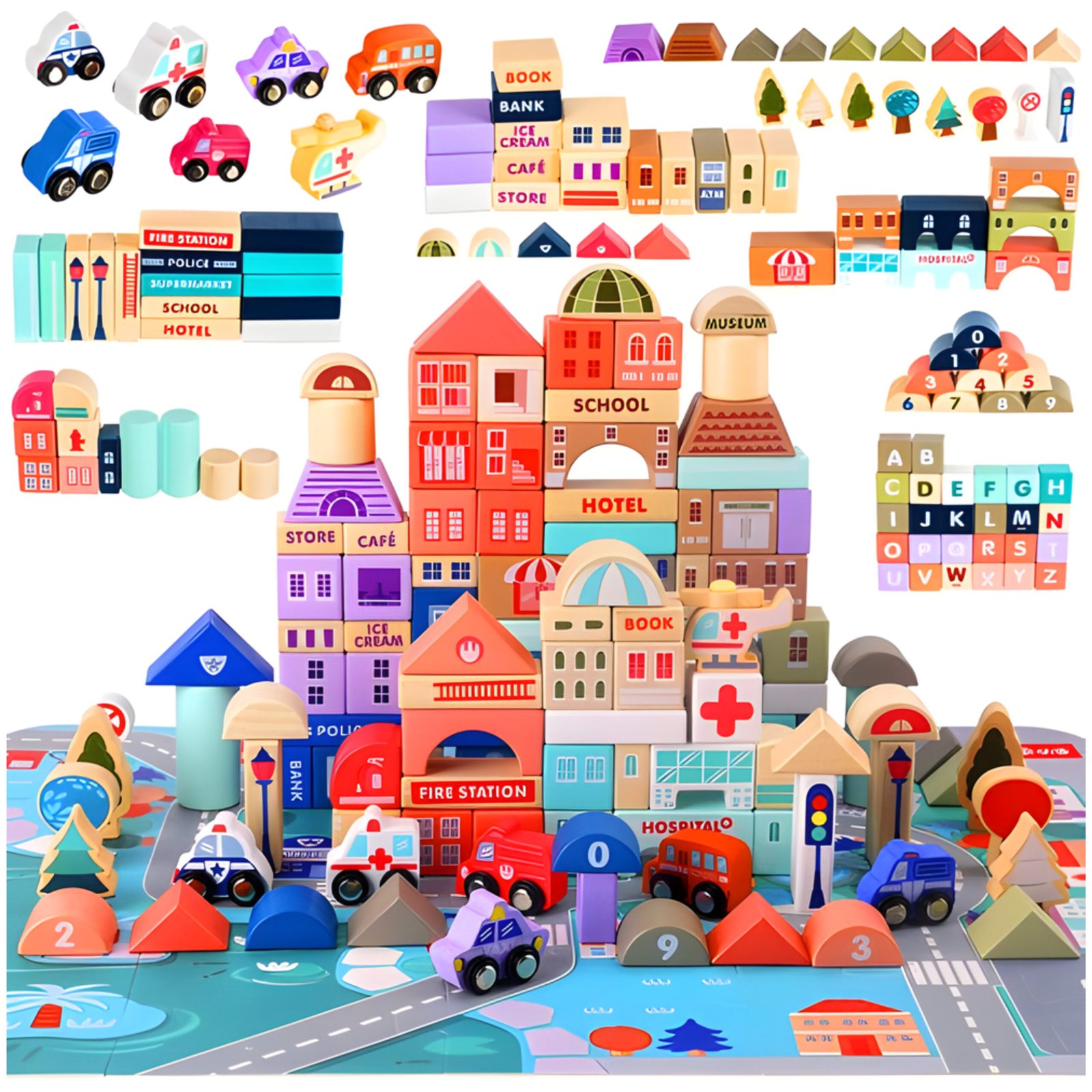 Een fantastische manier om de fantasie van je kindje tot leven te wekken en direct een complete speelwereld in de woonkamer te cre?ren met deze uitgebreide houten blokkenset! Deze indrukwekkende set van 115x blokken is de ideale keuze voor kleine architecten die dromen van het bouwen van hun eigen bruisende stad, inclusief een ziekenhuis, politiebureau en zelfs een caf?. Dankzij de bijgeleverde puzzelmat als ondergrond tover je de vloer in een handomdraai om tot een levendig wegennetwerk waar de leukste avonturen plaatsvinden.