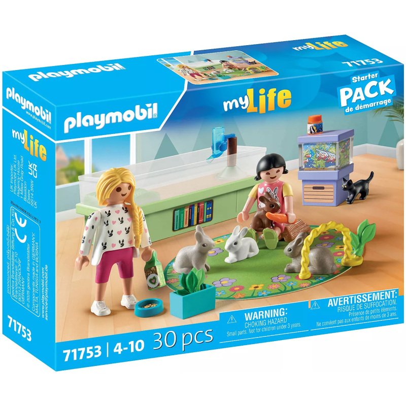 De konijnenfamilie is vandaag de tuin aan het verkennen. Ze hebben genoeg eten en water in hun verblijf. De konijnen voelen zich ook helemaal thuis bij hun buren, de kleine kat en de kleurrijke vissen in het aquarium. Vandaag is een drukke dag in de tuin voor de konijnenfamilie! Met hun gezellige hok, een speels katje om ze gezelschap te houden en een kleurrijk aquarium in de buurt, is er nooit een saai moment. Kijk hoe de konijnen door hun boog springen, knabbelen aan wortels en bladeren of nippen aan hun waterdispenser. De speelmat is perfect voor alle dieren om samen te verkennen. De PLAYMOBIL Familie met konijnenset bevat een vrolijke familie, een doos om lekkernijen in te bewaren en zelfs een voerzak met gemakkelijk vast te houden handvatten – ideaal voor eindeloos fantasierijk spelen met je nieuwe harige vrienden!