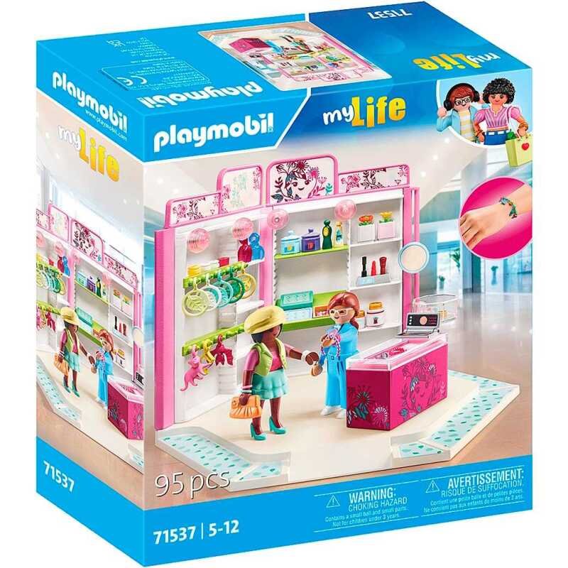 Veel winkelplezier in PLAYMOBIL City: deze boetiek uit de myLife serie heeft de accessoires om een outfit perfect te maken. De winkel bevat een vitrine, doosjes, armbanden, bloemensterren, lippenstift en allerlei andere make-up- en sieradenaccessoires. De siliconen kinderarmband, die ook wordt meegeleverd, kan worden versierd met verschillende bedels en kralen. De set kan vrij worden gecombineerd met andere myLife sets met het thema winkelen – zo kun je een compleet winkelcentrum samenstellen.