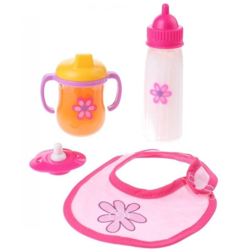 Poppen eetsetje 4-delig. Maak het spelen met poppen nog realistischer met deze 4-delige poppen eetset. De set bevat een slabbetje, speen, fles en drinkbeker, perfect voor het voeden van een babypop. De fles en beker bevatten vloeistof die beweegt wanneer ze worden omgedraaid, wat zorgt voor extra speelplezier!