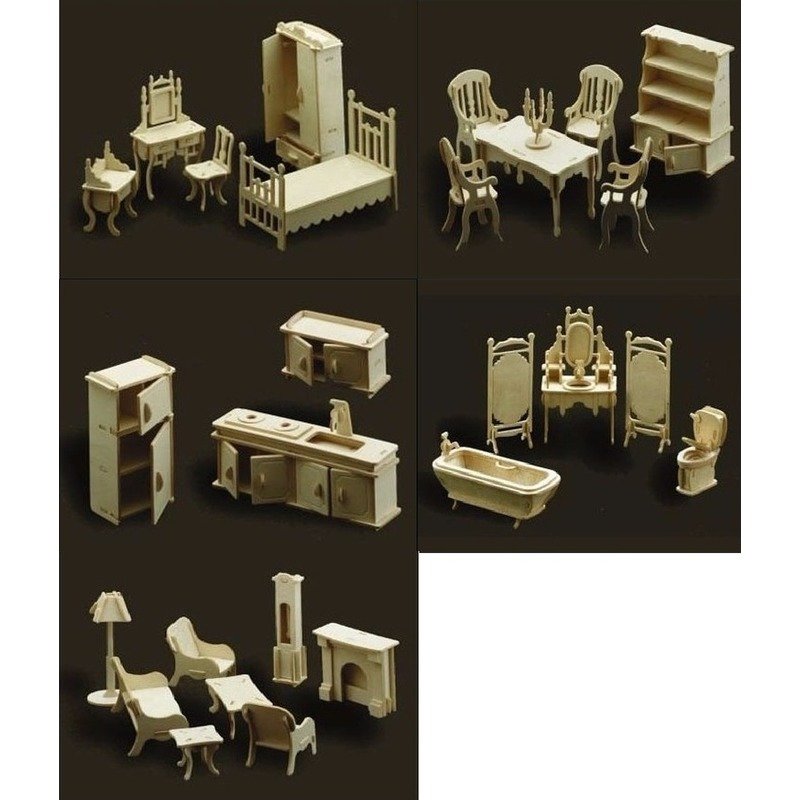 Poppenhuis meubels inrichting set. Houten bouwpakket met kleine poppenhuis meubels voor de keuken, eetkamer, huiskamer, slaapkamer en badkamer om het poppenhuis compleet in te richten. De meubels zijn van blank ongelakt hout en in klassieke stijl. Schaal: 1:12. Geschikt vanaf 6 jaar. , Dit artikel bestaat uit:, 1x Poppenhuis meubels – slaapkamer – schaal 1:12 – hout – speelgoed, 1x Poppenhuis meubels – eetkamer – schaal 1:12 – hout – speelgoed, 1x Poppenhuis meubels – keuken – schaal 1:12 – hout – speelgoed, 1x Poppenhuis badkamer meubeltjes set – hout – 5-delig – DIY bouwset, 1x Poppenhuis meubels huiskamer – hout – bouwpakket – 8x stuks inhoud