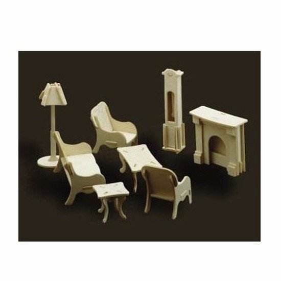 Poppenhuis meubels huiskamer – hout – bouwpakket – 8x stuks inhoud