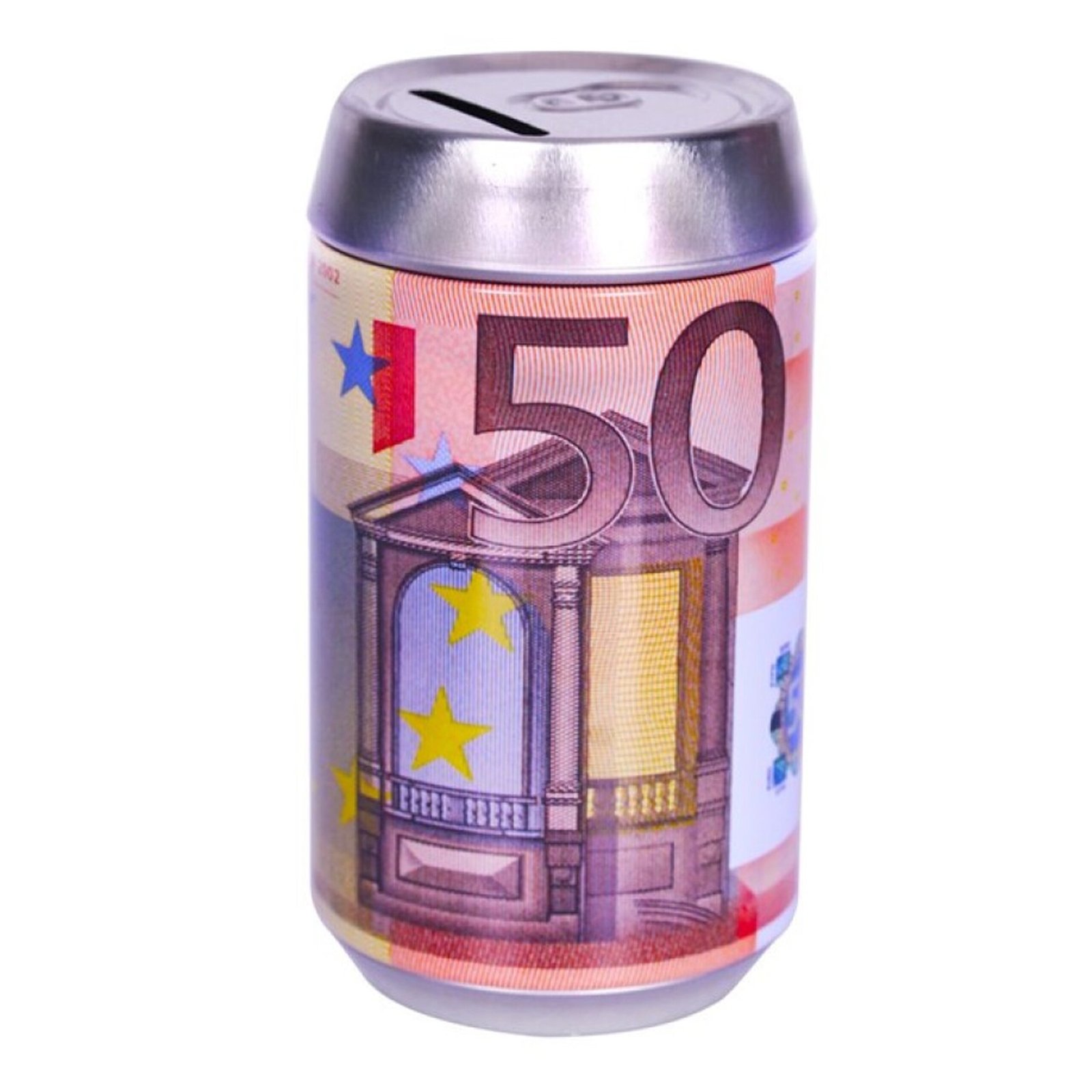 Spaarpot blik – 50 euro biljet print – metaal – D7 x H12 cm