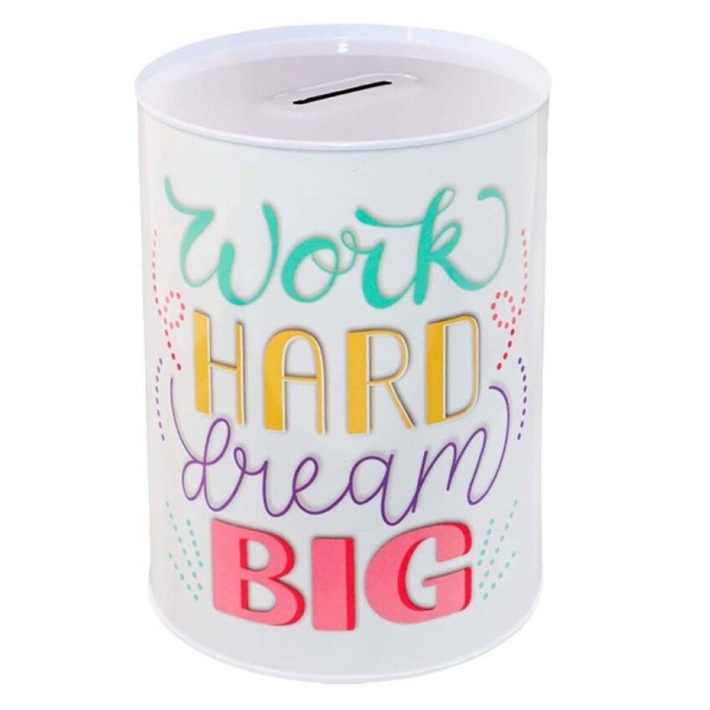 Spaarpot blik Tekst Work Hard Dream Big – gekleurd – 8 x 12 cm – Kinderen/volwassenen