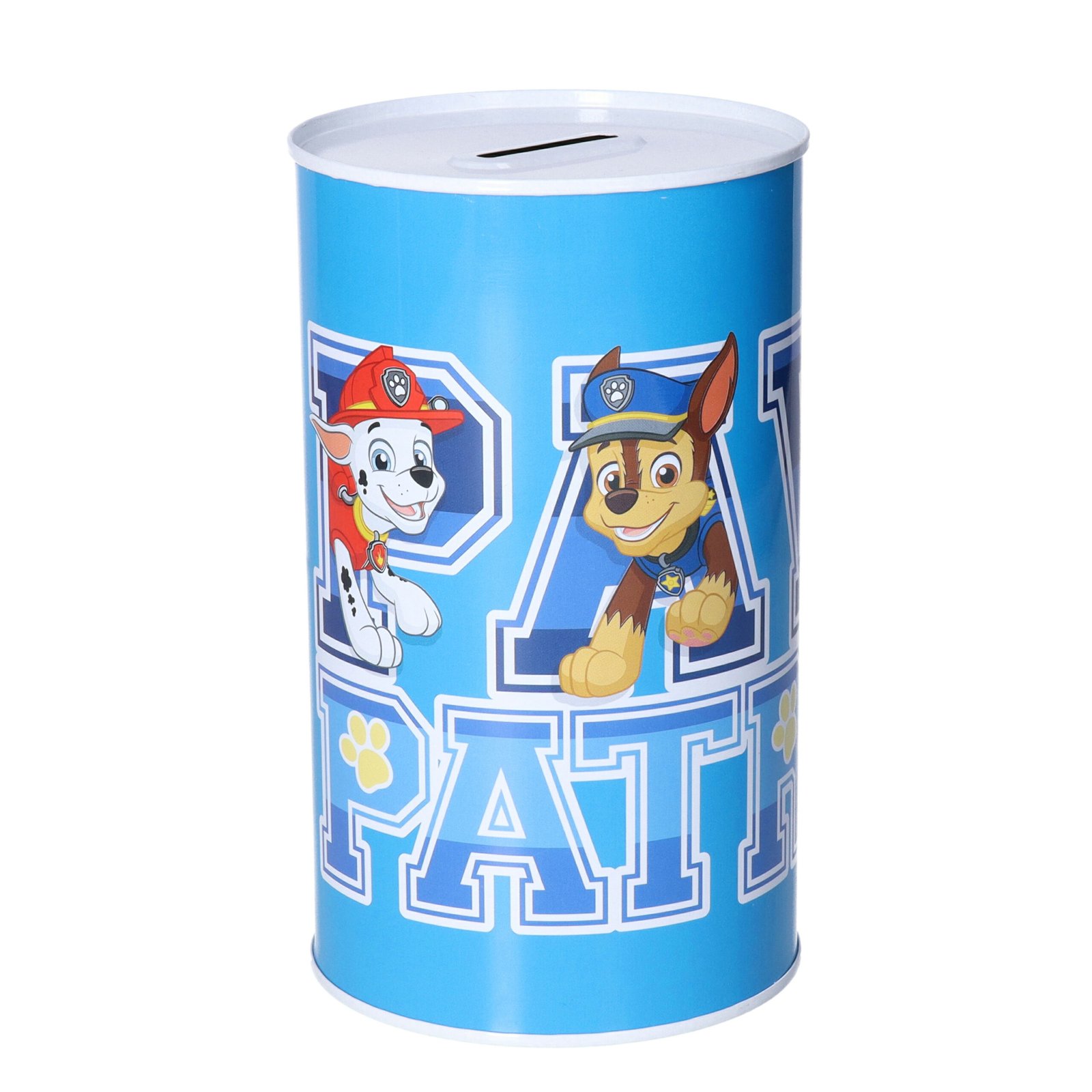 Spaarpot blik met een print van Paw Patrol, tekst en karakters. Blik spaarpot met een kleurenmix print. Te openen met bijvoorbeeld een blikopener. Materiaal: metaal/blik. Afmeting: ongeveer 10 x 17 cm. Geschikt voor kinderen.