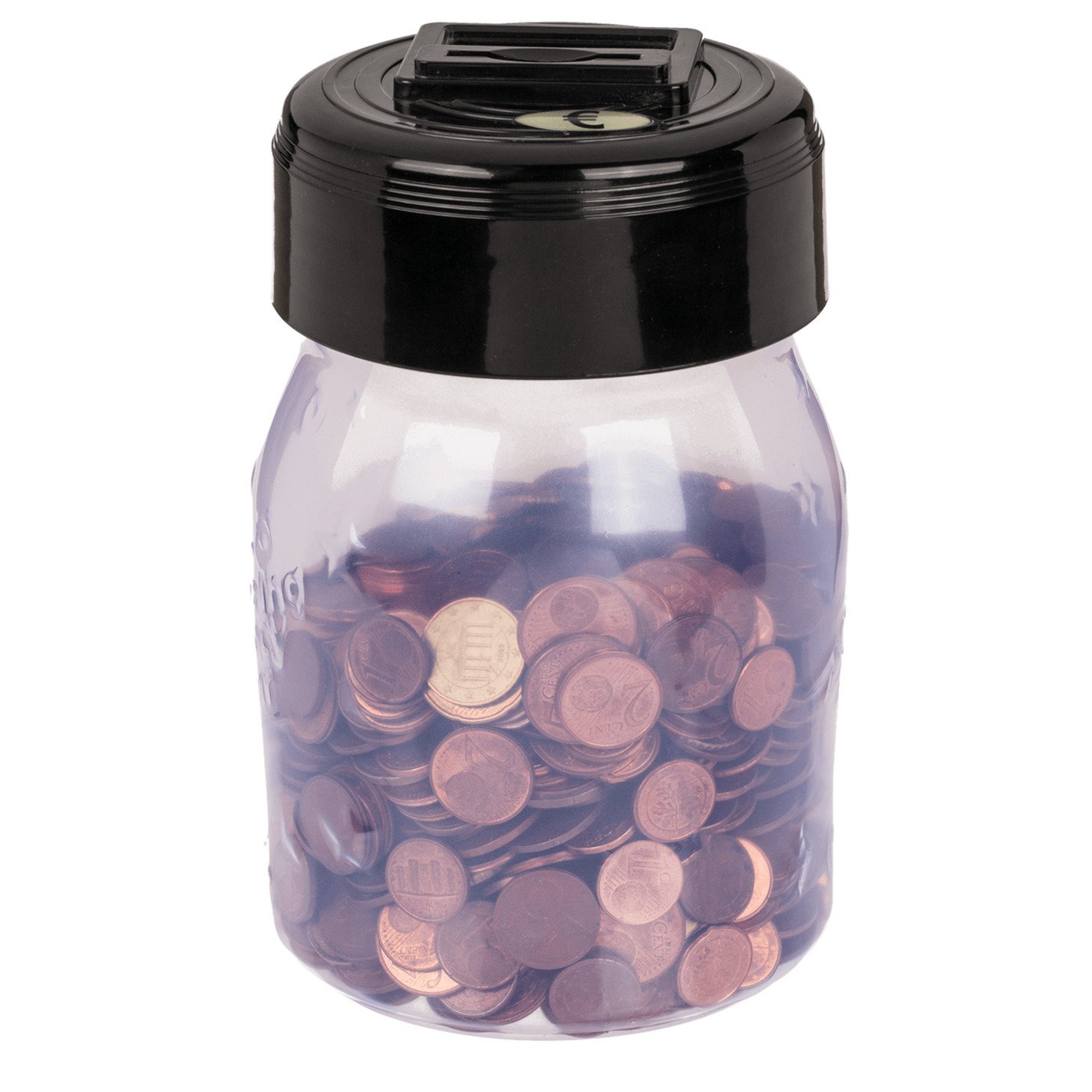 Spaarpot met een zelf tellend Euro geld systeem op 2x AA betterijen(niet inclusief). Geschikt voor kinderen en volwassenen. Deze spaarpot is gemaakt van kunststof en is 18 x 10 cm in de kleuren zwart/transparant. In geschenkdoos. Lui rijk worden. Een super cadeau/kado voor jong en oud.