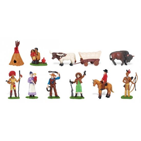 Plastic speelgoed figuren indianen en cowboys. Deze speelset bestaat uit 11 plastic wild westen poppetjes zoals cowboys, indianen, vee dieren en accessoires. De plastic figuren hebben een formaat die ligt tussen de 4 en 7,5 cm. Geschikt voor kinderen vanaf 3 jaar.
