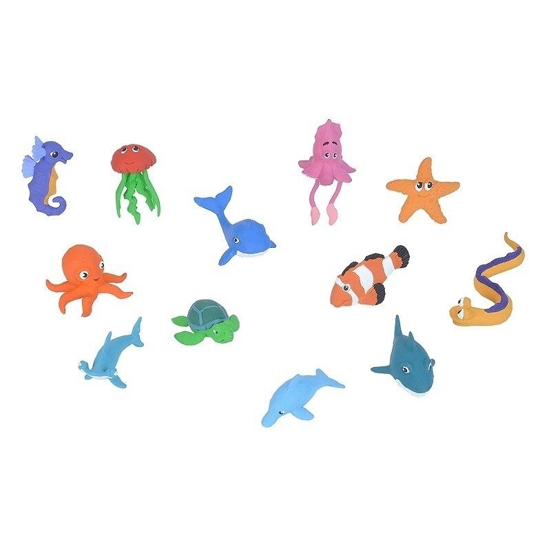 Zeedieren/oceaan baby dieren speelgoed figuren 12-delig. Set van 12 speelgoed baby zeedieren van diverse afmetingen. Deze set bevat een dolfijn, inktvis, hamerhaai, zeepaardje, zeeschildpad, grote witte haai, octopus, kwal, blauwe vinvis, zeester, paling en anemoonvis. Materiaal: kunststof. Speelfiguren kleine diertjes speelgoed.