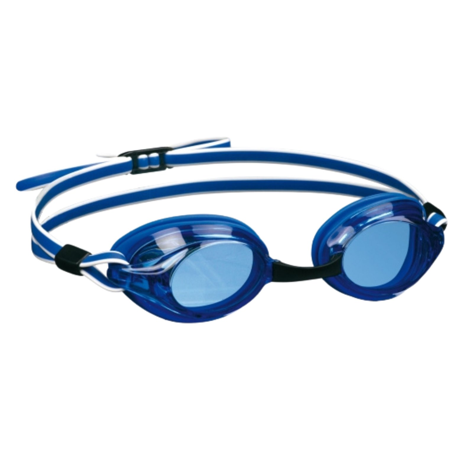 Blauw witte zwembril voor volwassenen. Zwembril met polycarbonaat lenzen met UV bescherming en anti condens laag. Deze blauw/witte bril heeft dubbele bandjes van siliconen en heeft een verstel clip. Ook de neusbrug van deze bril is verstelbaar.